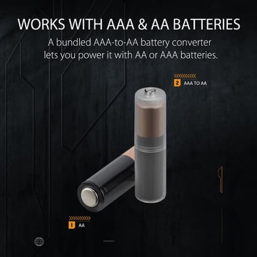 A bundled AAA-to-AA battery converter lets you power the TUF Gaming M4 Wireless with AA or AAA batteries. Pairing the smaller AAA battery with the converter results in a 10% weight reduction, which can lead to faster movements.